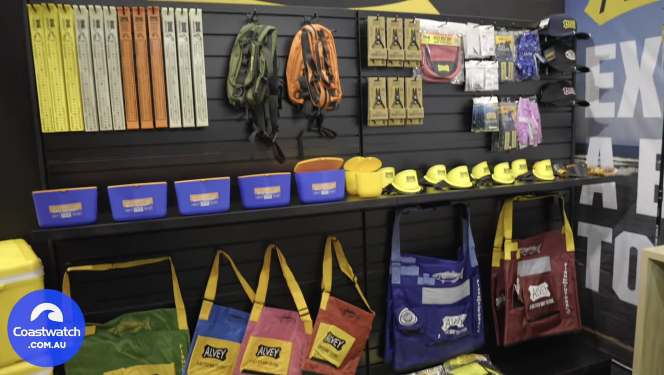 We’ve got our accessory range here, some staples there, they’ve been around in Alvey for quite some time… your measuring rulers, your bait buckets. Rod buckets and wading bags are always a staple in Alvey for beach fishing, so plenty of those to see. Just some new colours and designs there, like the wading bags. Other than that, we’ve got our reel range that we released late last year, so you’ve got your captain series of reels, five models in that, and then the commander series of reels on the end there, three models in that one.