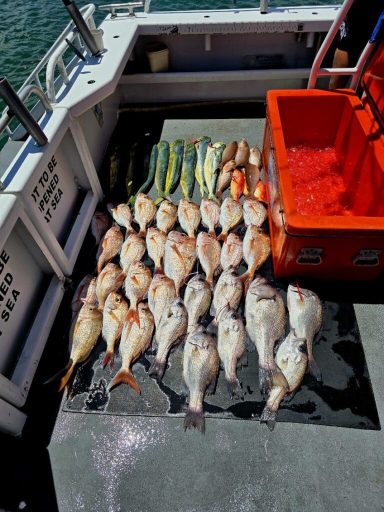 Snapper, pearl perch and dolphin fish out wide.
