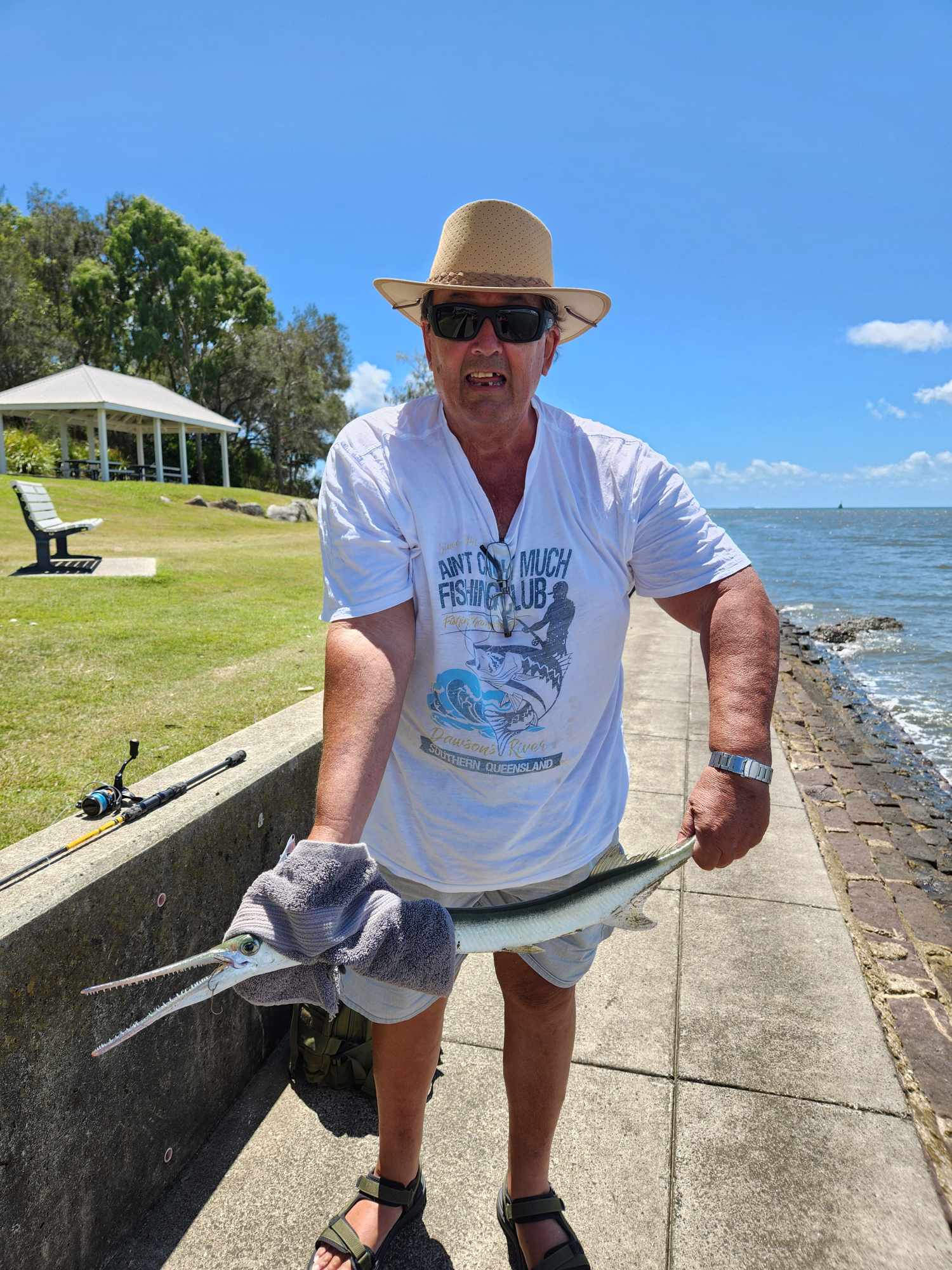 The flathead pictured was taken on 6lb braid, No1 Kumho gangs, 12lb J-Thread fluoro, and a Gary Howard 1-4kg spin stick. Ian got nailed by a stonker flathead, but when it came to the surface, this toothy long tom was not happy (picture below).
