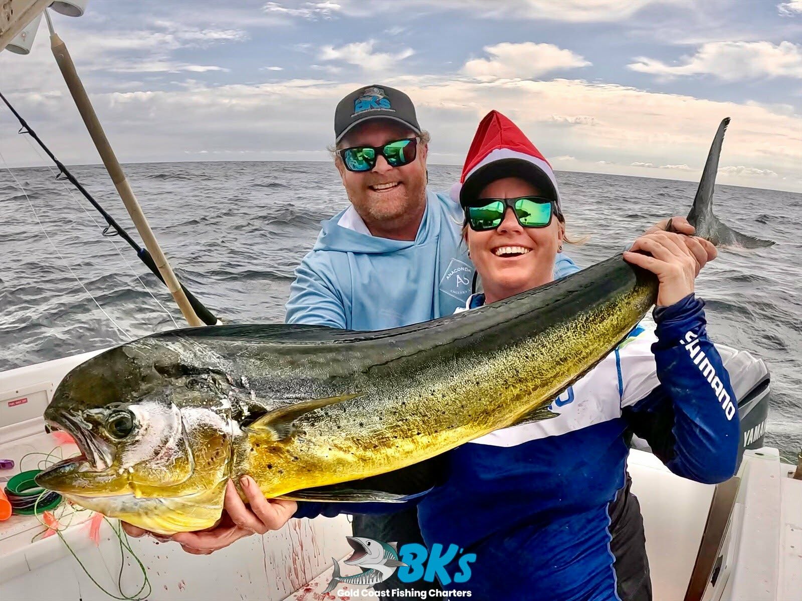 Striped Tuna have been showing in good numbers across the 36 to 50 fathom reefs, while small Mahi Mahi have been schooling around the FADs, with one decent sized fish caught on the 24th of December by the team (see picture below)