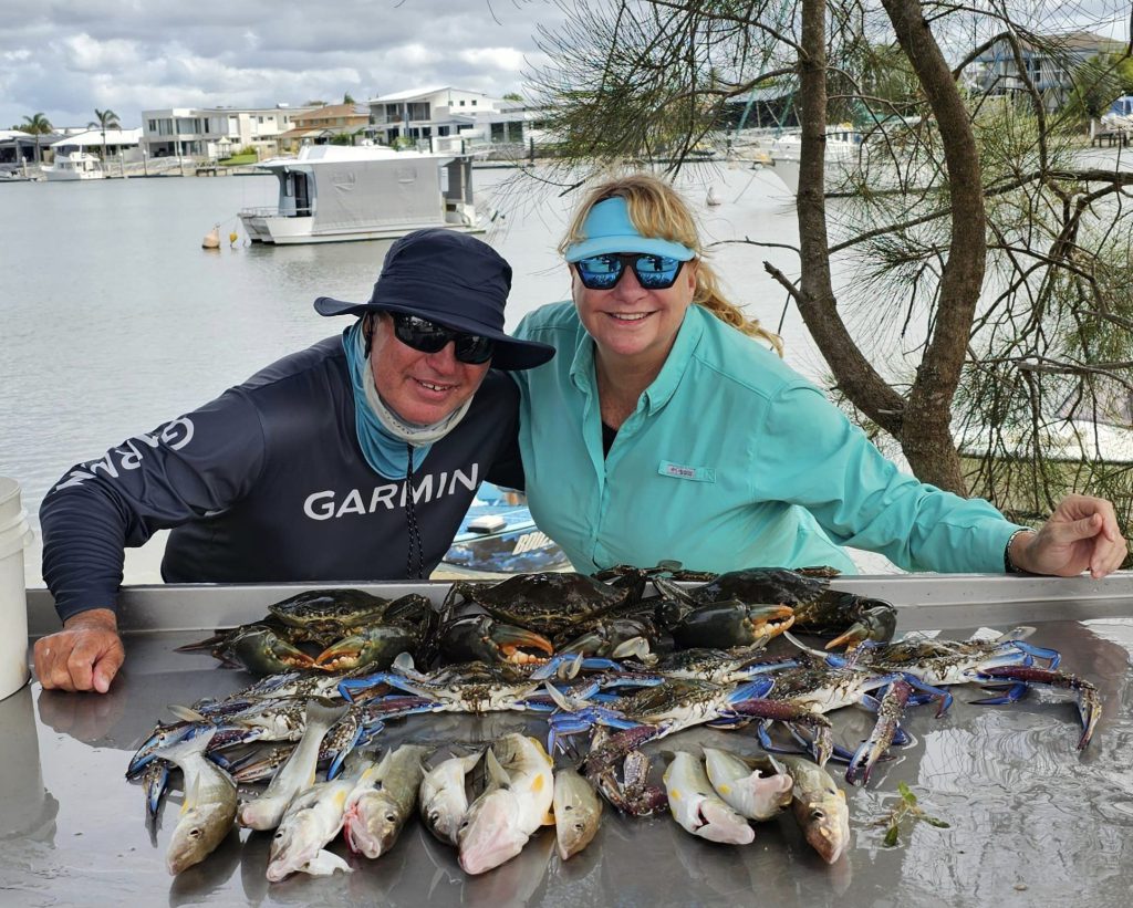 Pic below is Gold Coast estuary guide and charter skipper Ross McCubbin and Karla Herbert-Evans with a nice feed of mud and sand crabs and whiting caught in Southport Broadwater last week
