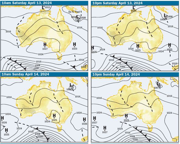 Charts: The charts and weather models are indicating that there’ll be a large area of high pressure over the southern part of the country and in the Tasman Sea extending a ridge along the Qld Coast, which will generate SE winds. There is a low, ex TC Paul in the Coral Sea, which is not expected to impact the Qld coast, apart from tightening the gradient between it and the ridge of high pressure, causing fresher SE winds in FNQ