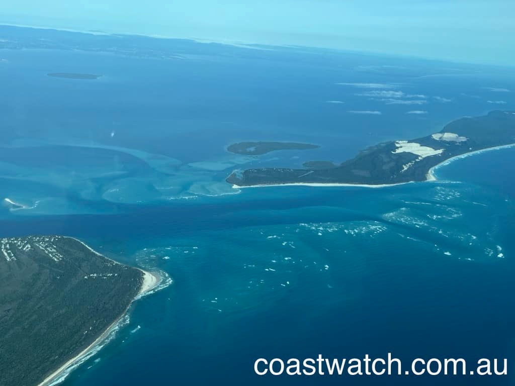 Swell & Coastal Bars: The swell offshore is expected to be Easterly at about 1m and it should be a bit smaller inshore and on the coastal bars. Based on that, South Passage Bar should be workable with the usual caution required when crossing and Noosa, Jumpinpin and Currumbin Bars are shallow right across, but workable if you have local knowledge. We got this aerial shot of South Passage Bar a week ago and it shows the banks and channels and wouldn’t have changed much since it was taken