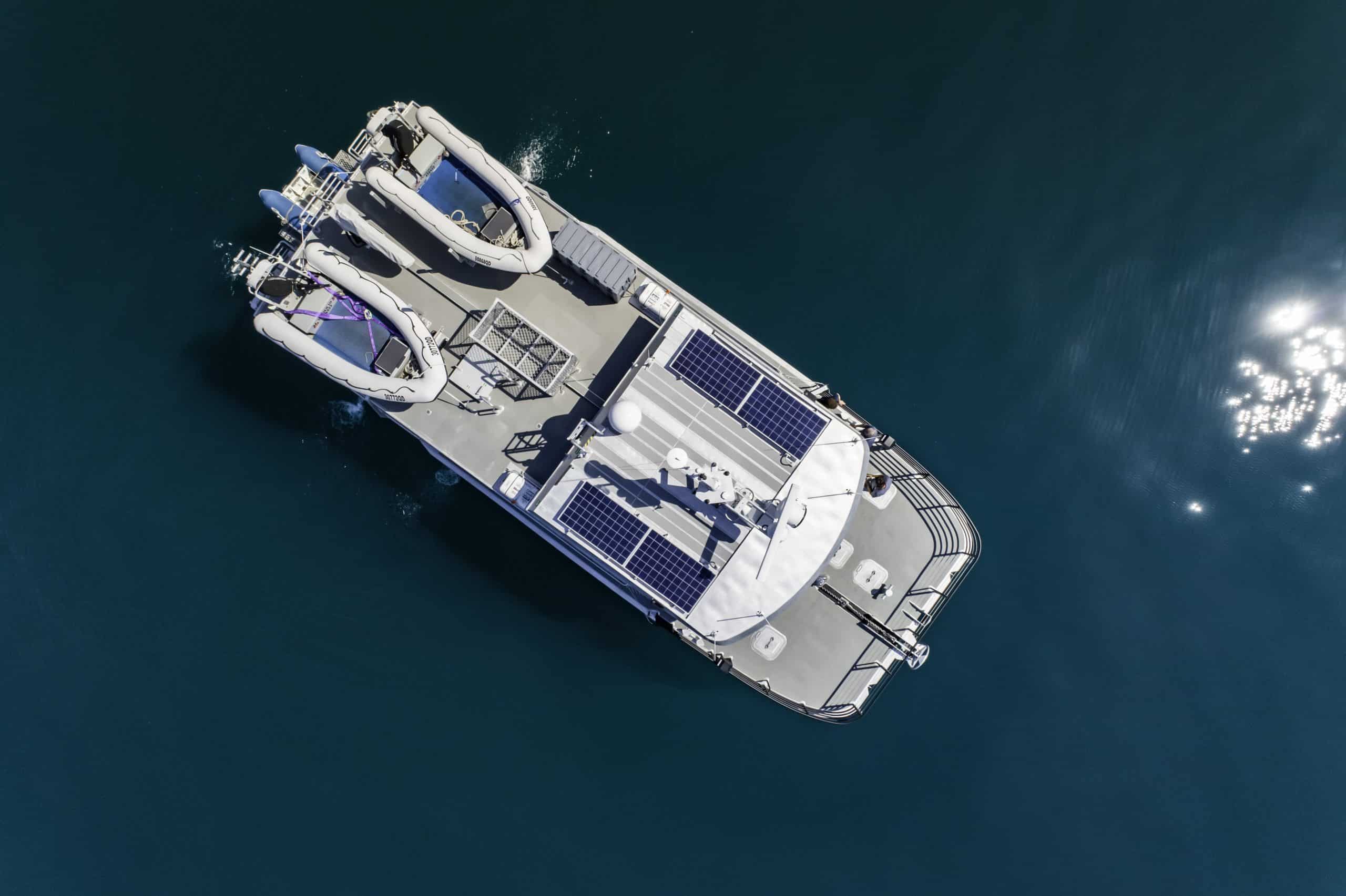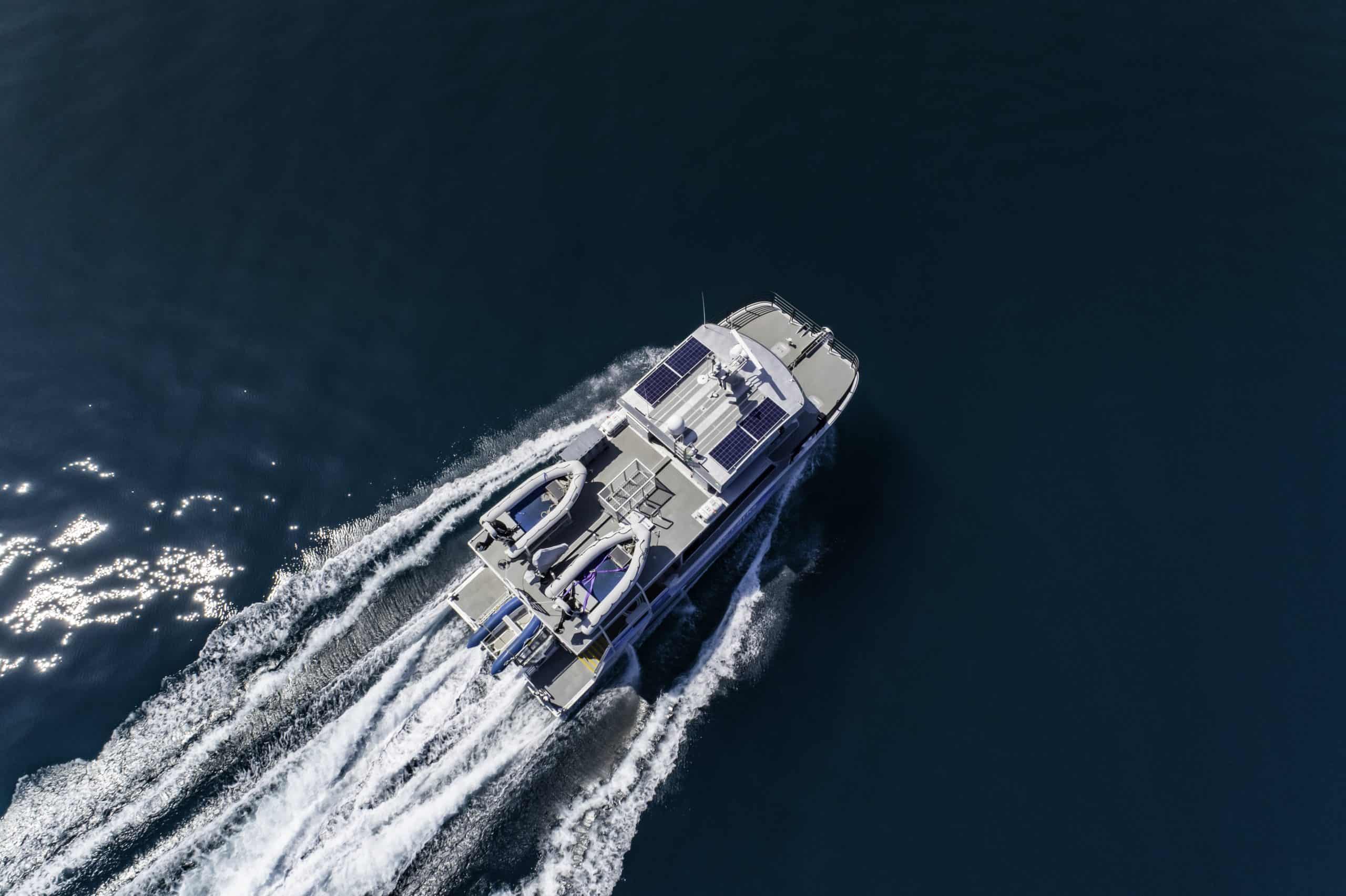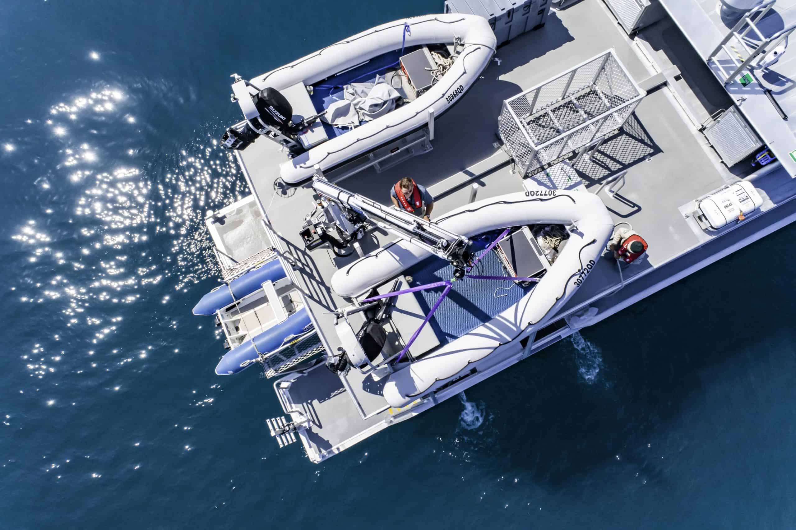 Designed by Incat Crowther featuring a wave piercing hull design, the new vessel will be required to operate independently for up to 10 days away from port in remote offshore reef areas with up to 7 persons onboard, and a range of 500 nautical miles. Unique to the design is a central narcelle to improve seakeeping and performance in head seas. and a custom dinghy retrieval system that can safely and easily launch, store and retrieve a 1 x 3.4m rigid inflatable tender.